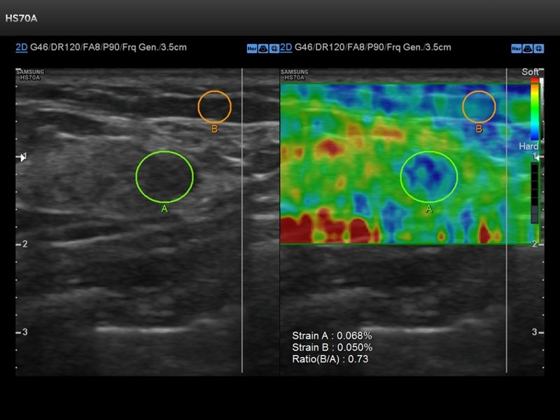 Breast elastography is an advanced ultrasound technique that measures the stiffness or elasticity of breast tissue. Since cancerous tissues are usually firmer than normal tissue, elastography helps in distinguishing benign (non-cancerous) from suspicious breast lumps. It is often used as an additional tool along with routine breast ultrasound and mammography.